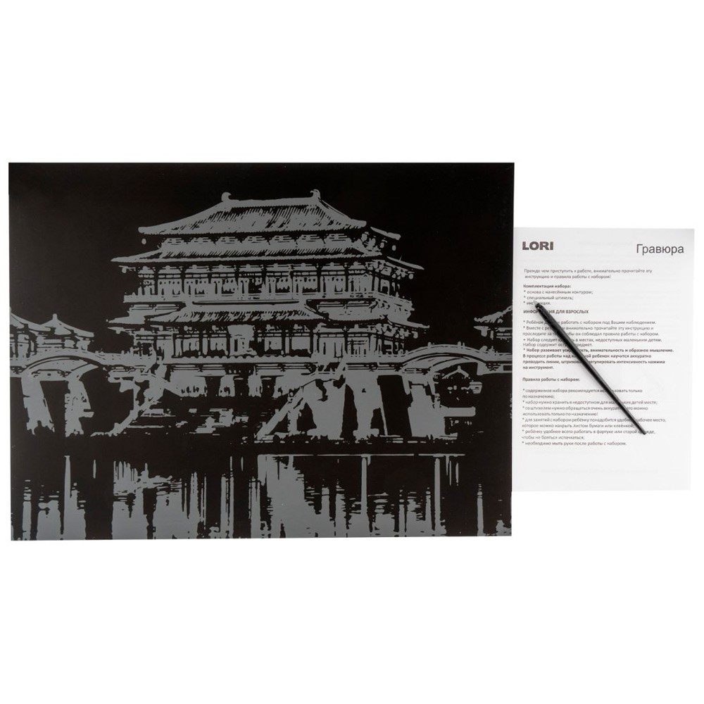 Комплектация: основа с нанесенным контуром рисунка, специальный штихель, инструкция