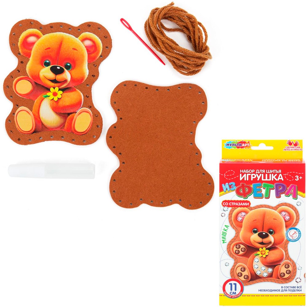 Комплектация: пластиковая игла - 1 шт., выкройка из фетра, нитки, наполнитель, стразы, инструкция