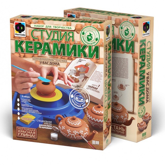 Комплектация: гончарный круг с электрическим мотором, натуральная терракотовая глина, краски для росписи, кисти, скульптурная стека, инструкция