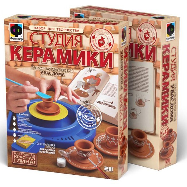 Комплект: глина, гончарный круг, стек, краски, кисть, инструкция