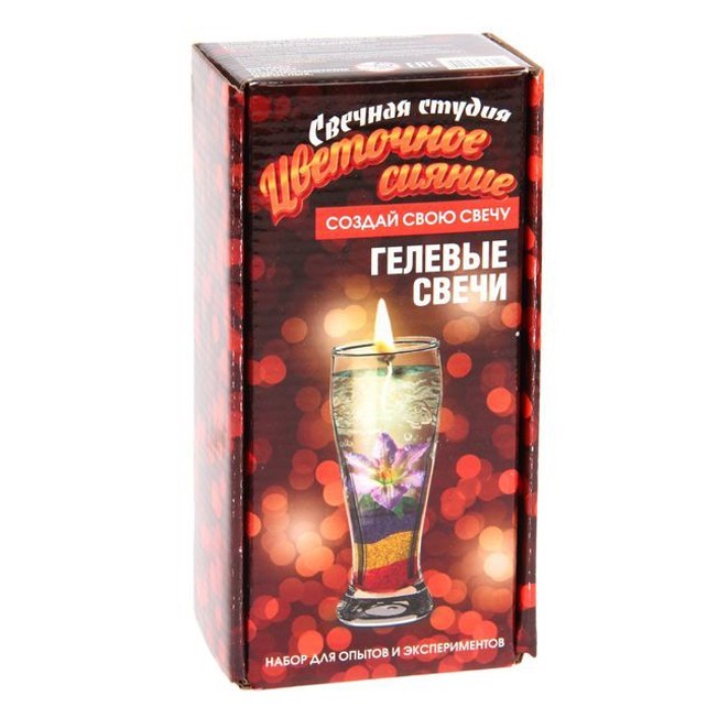 «Цветочное сияние» - набор для творчества из серии «Свечная студия». С ним можно своими руками сделать дизайнерскую гелевую свечу с цветным песком и искусственным цветочком. Работа несложная, и, если следовать инструкции, с ней справится и ребенок. В состав геля входят только натуральные компоненты. Такая свечка станет прекрасным подарком или украшением интерьера.