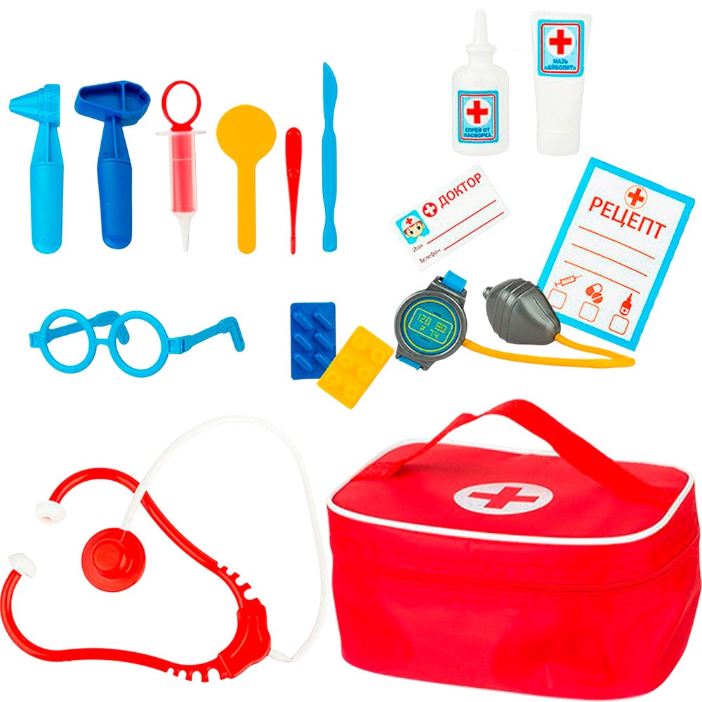 Комплектация: мазь - 1 шт., спрей - 1 шт., очки - 1 шт., термометр - 1 шт., шприц - 1 шт., ларингоскоп - 1 шт., молоток - 1 шт., лопатка окулиста - 1 шт., тонометр - 1 шт., таблетки круглые - 1 шт., таблетки овальные - 1 шт., скальпель - 1 шт., фонендоскоп - 1 шт., визитка доктора - 1 шт., рецепт - 1 шт., сумка - 1 шт.