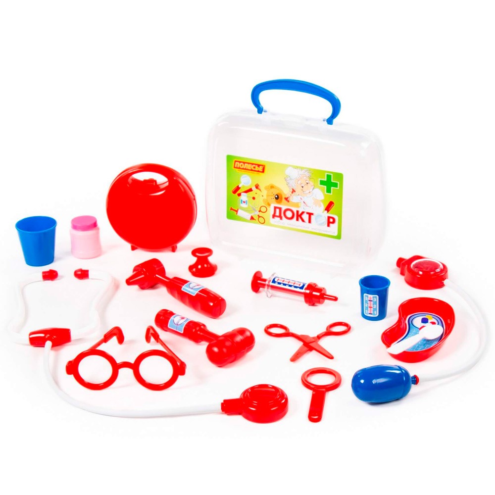 Комплектация: ножницы - 1 шт., очки - 1 шт., лупа - 1 шт., шприц - 1 шт., лоток для инструментов - 1 шт., ложечка - 1 шт., стетоскоп (для выслушивания сердца и лёгких) - 1 шт., тонометр (для измерения давления) - 1 шт., отоскоп (инструмент лор-врача) - 1 шт., молоточек - 1 шт., мерный стаканчик с крышкой - 1 шт., стаканчик - 1 шт., баночка - 1 шт.,
