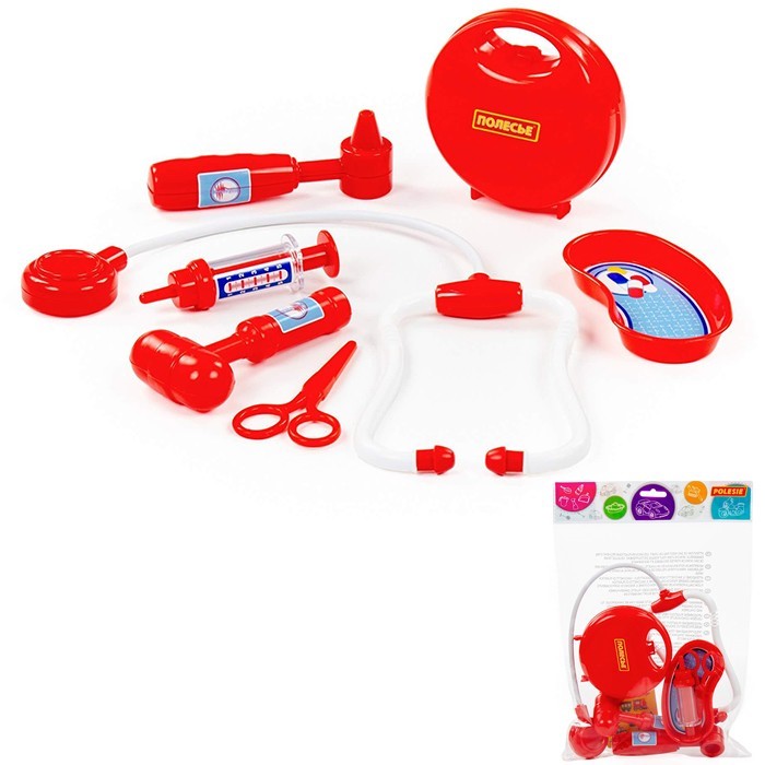 Комплектация: ножницы - 1 шт., шприц - 1 шт., лоток для инструментов - стетоскоп (для прослушивания сердца и лёгких) - 1 шт., отоскоп (инструмент лор-врача) - 1 шт., молоточек - 1 шт., медицинский чемоданчик - 1 шт.