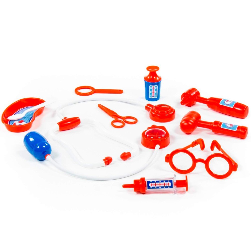 Комплектация: ножницы - 1 шт., очки - 1 шт., лупа - 1 шт., шприц - 1 шт., лоток для инструментов - 1 шт., ложечка - 1 шт., стетоскоп (для прослушивания сердца и лёгких) - 1 шт., тонометр (для измерения давления) - 1 шт., отоскоп (инструмент лор-врача) - 1 шт., молоточек - 1 шт., мерный стаканчик с крышкой - 1 шт.