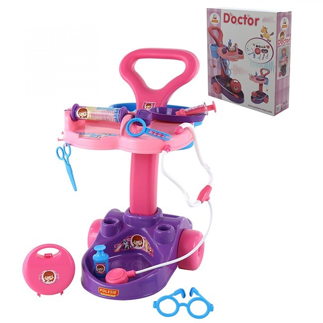 Набор доктора на столике-тележке подойдет для сюжетно-ролевых игр в больницу. В комплект входит все, чтобы лечить кукол и плюшевых мишек: стетоскоп, шприц, лоток, очки, ножницы, прибор для проверки зрения и другие инструменты. Столик состоит из двух полочек, сверху и снизу, оснащен вращающимися колесами и ручкой для удобства перевозки. Игра с таким набором позволит ребенку примерить на себя взрослую профессию, потренировать воображение и мелкую моторику.