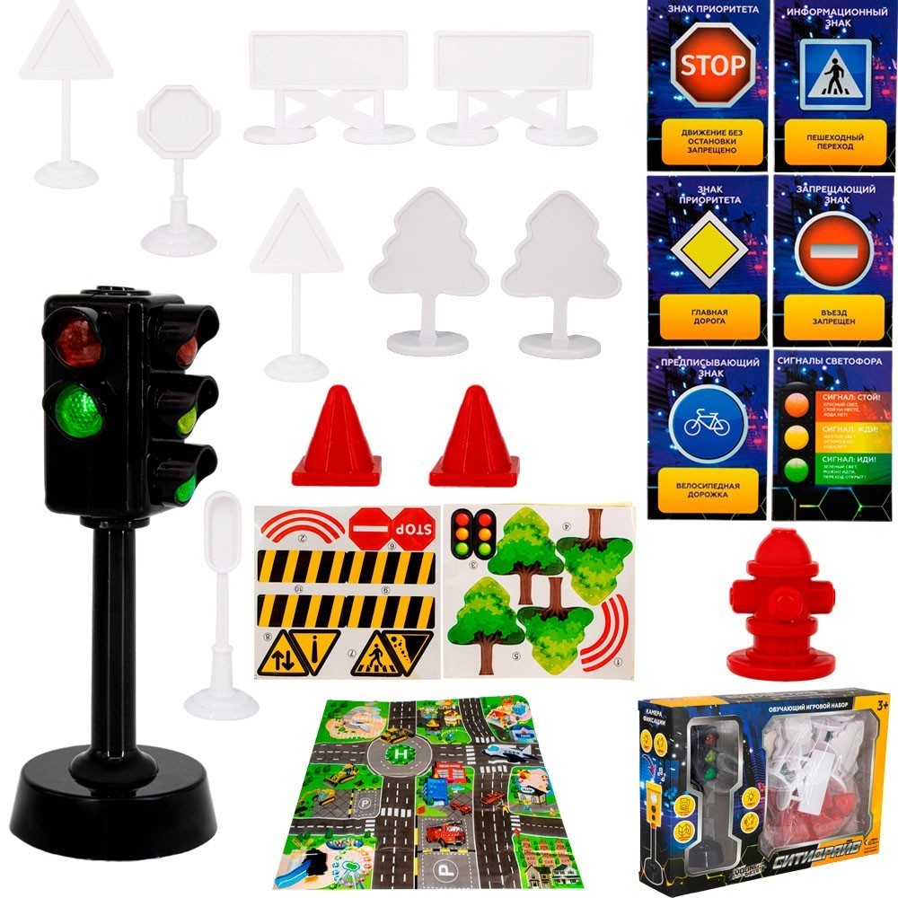 Комплектация: светофор (11,8 х 4,5 х 4,5 см) – 1 шт., двусторонние карточки (10 х 7 см) – 6 шт., игровое поле (60 х 60 см) – 1 шт., наклейки со знаками дорожного движения – 10 шт., фигурки дорожных знаков – 12 шт.