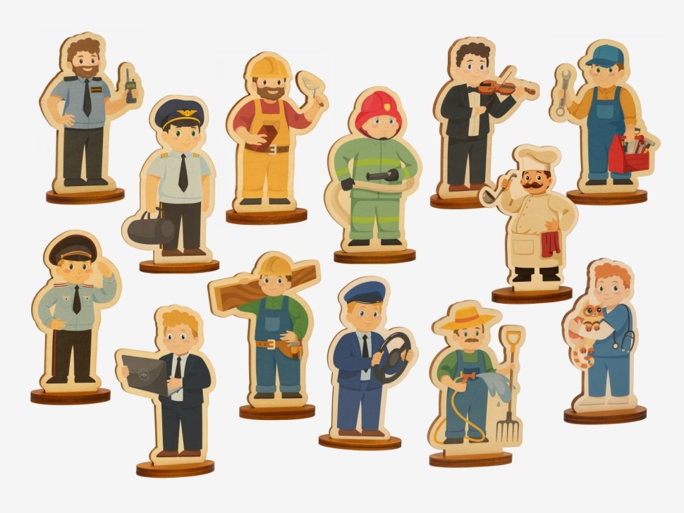 Фигурки выполнены из высококачественной фанеры и тщательно отшлифованы. Закругленные края обеспечивают безопасность во время игры, а устойчивое основание позволяет удобно расставлять фигурки. Изображения нанесены современным методом печати с использованием красок, устойчивых к истиранию и выцветанию даже при активной эксплуатации. Материалы сертифицированы и полностью соответствуют требованиям ФГОС ДО и СанПиН.