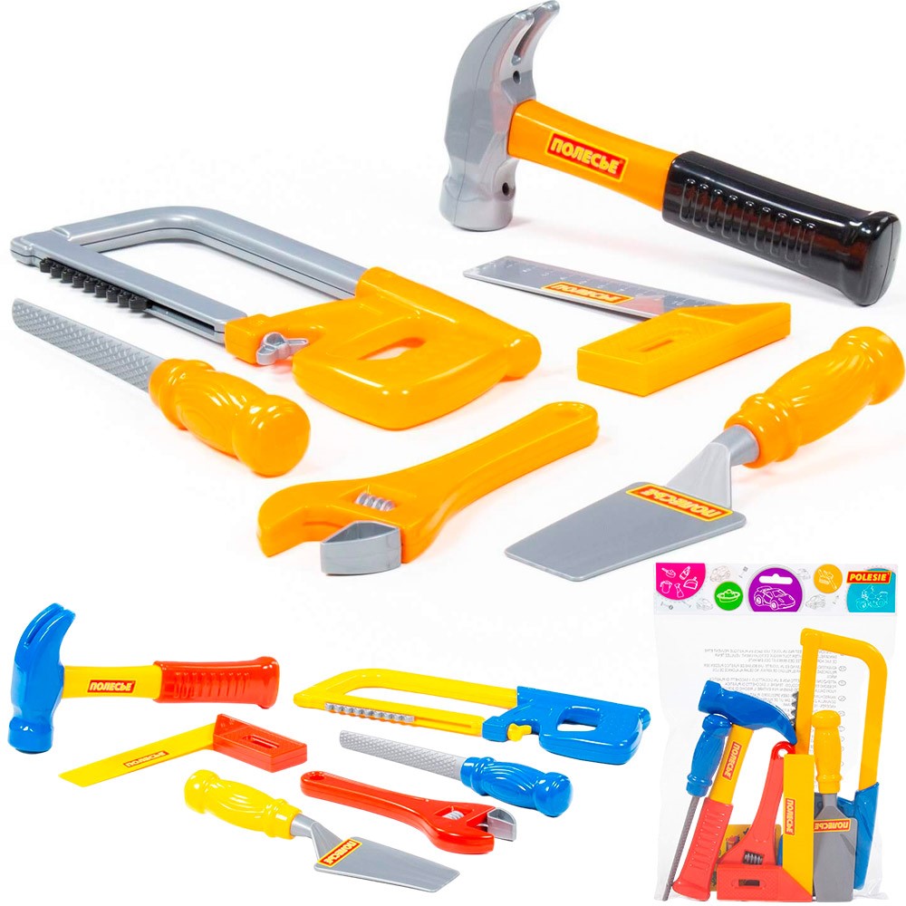 Комплектация: молоток – 1 шт., пила лучковую – 1 шт., угольник с линейкой – 1 шт., разводной гаечный ключ – 1 шт., рашпиль – 1 шт., мастерок – 1 шт.