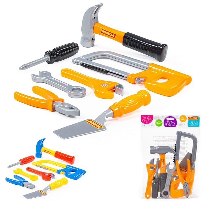 Комплектация: молоток – 1 шт., пила лучковую – 1 шт., разводной гаечный ключ – 1 шт., гаечный ключ комбинированный: рожковый и накидной – 1 шт., мастерок – 1 шт., пассатижи – 1 шт., отвертка (крестообразный шлиц) – 1 шт.