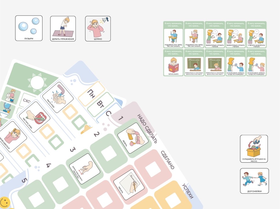 Визуализация для демонстрации последовательности событий в течении дня. Помогает снять напряжение, поддерживает мотивацию ребенка.