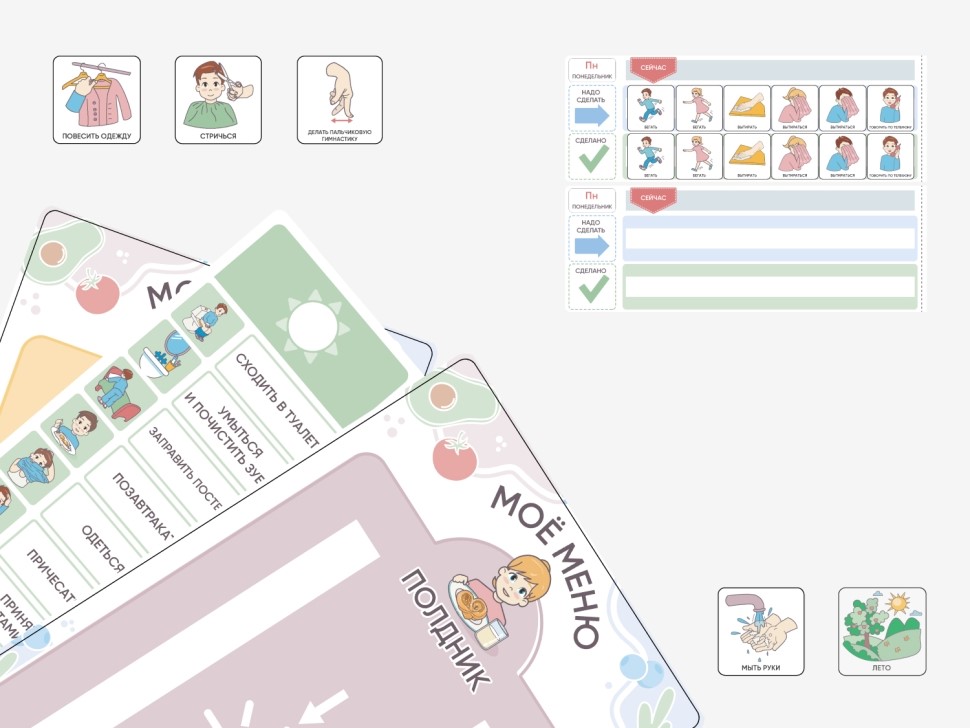 Визуализация для демонстрации последовательности событий в течении дня. Помогает снять напряжение, поддерживает мотивацию ребенка.