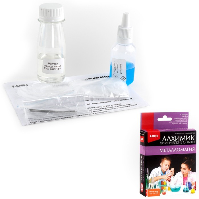 Комплектация: раствор сульфата меди (II), солевой раствор, алюминевая проволока, перчатки, инструкция