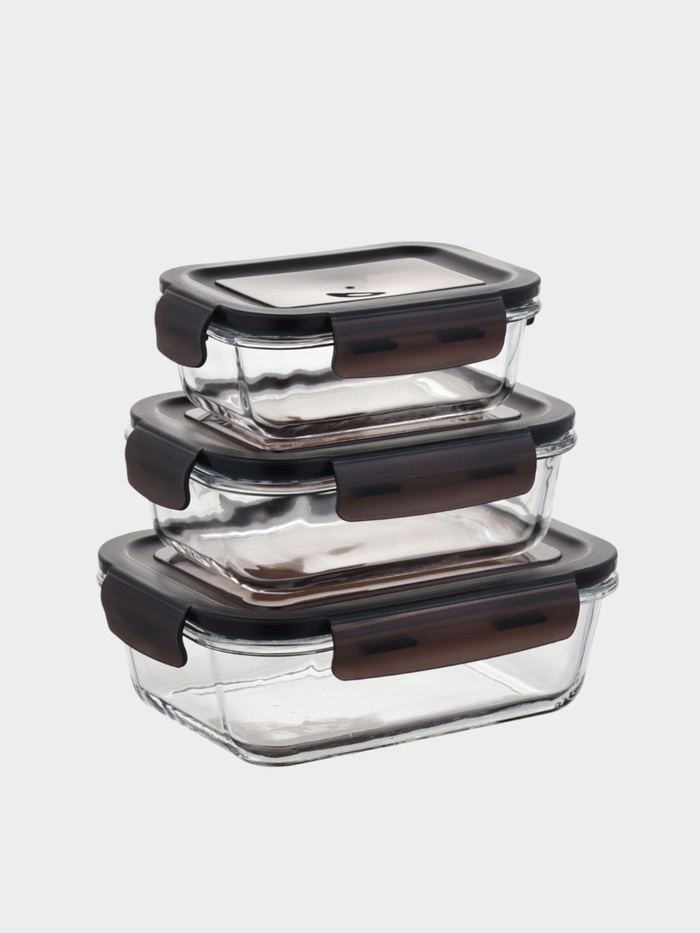 Набор контейнеров, 3 шт.: 410/690/1040 мл, стекло, прозрачный, черная крышка
