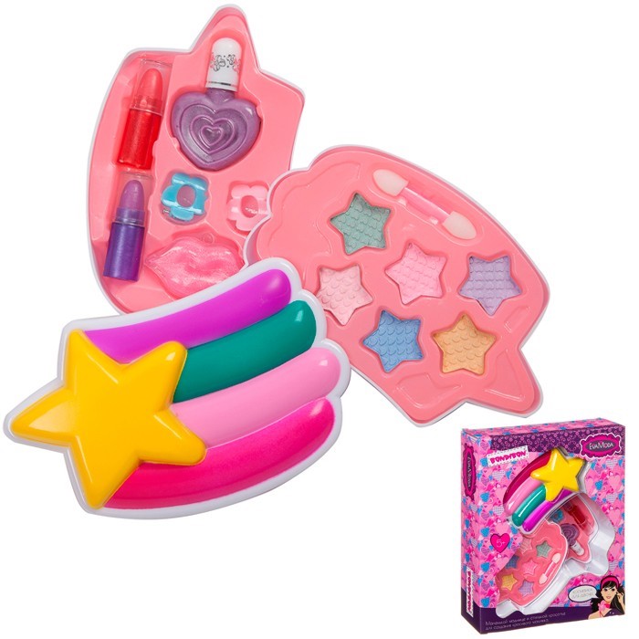 Комплектация: косметичка-звёздочка, тени для век 6 оттенков (3 г), помада 2 оттенка (1,6 г), блеск для губ (1,2 г), лак для ногтей (5 г), аппликатор, заколки (2 штуки).
