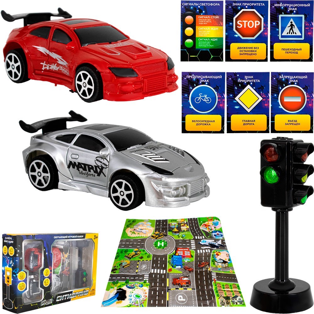 Комплектация: маленькие машинки (9,5 х 3,5 х 5 см) – 2 шт. (цвет микс), светофор (11,8 х 4,5 х 4,5 см) – 1 шт., карточки с правилами ПДД (10 х 7 см) – 6 шт., дорожная карта (60 х 60 см) – 1 шт.