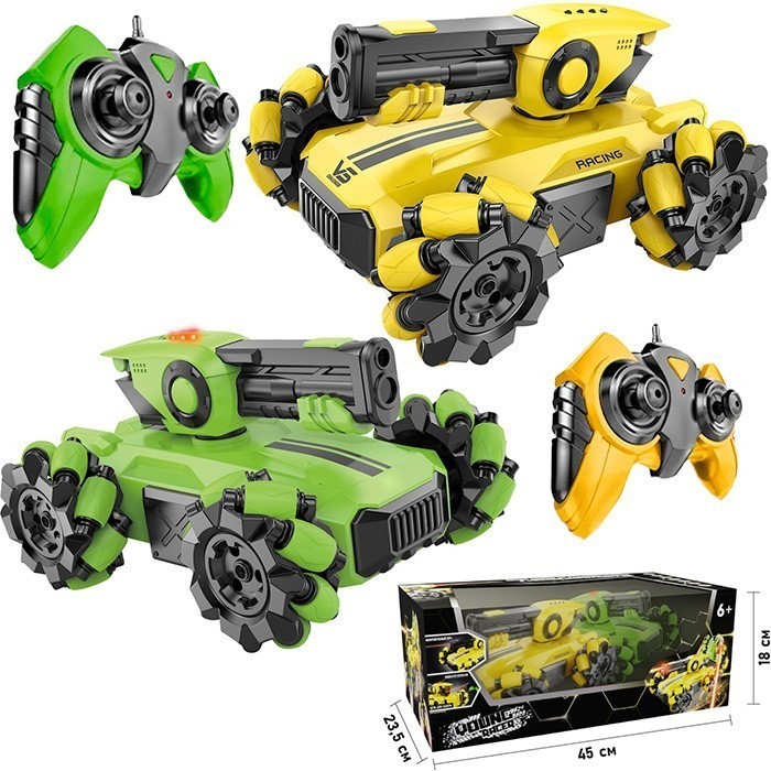 Комплектация: машинка с пушкой – 2 шт., джойстик управления – 2 шт., аккумулятор (7.4V) – 2 шт., USB зарядка – 2 шт.