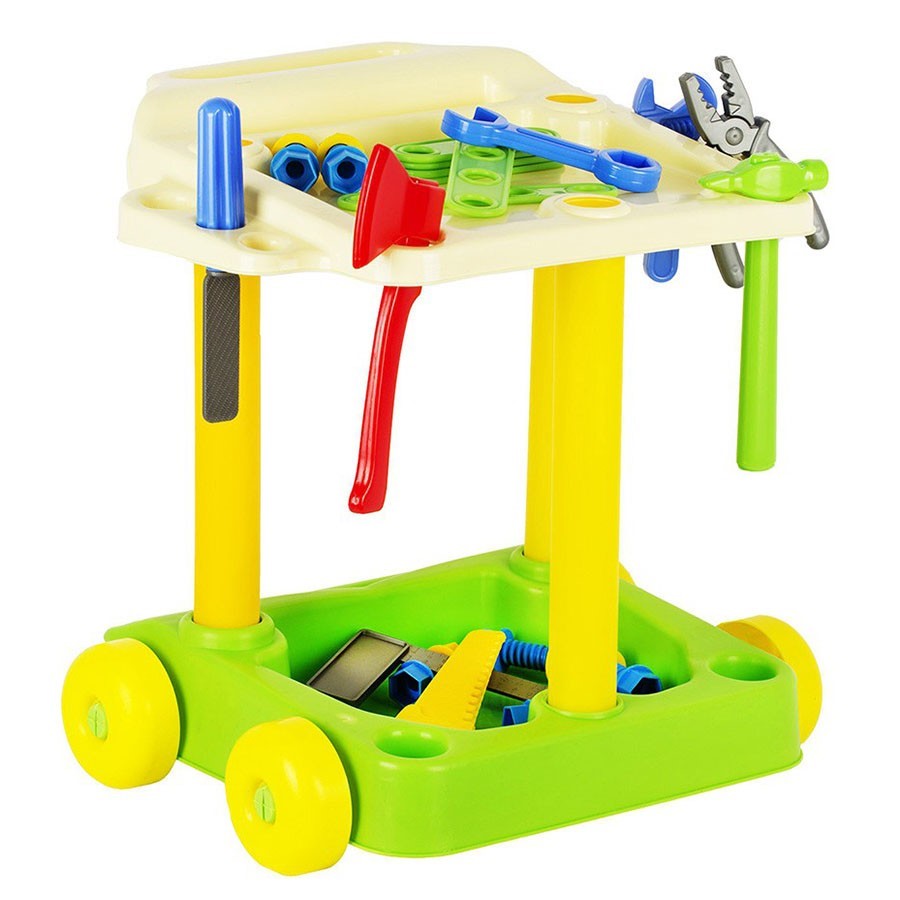 С таким набором ребенок легко сможет почувствовать себя настоящим мастером на все руки. На удобной тележке с колесиками и двумя полками расположены маленькие копии самых разных инструментов - топор, пила, молоток, гаечный ключи и многие другие, хорошо детализированные и реалистичные. Набор отлично подходит для сюжетно-ролевых игр, формирует у ребенка бытовые навыки и привычки, развивает моторику и воображение. Все элементы набора изготовлены из качественных нетоксичных материалов, безопасных для здоровья ребенка. Товар представлен в ассортименте.