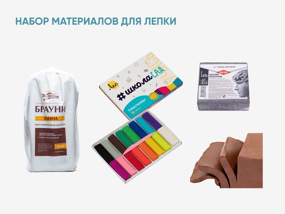 Комплект материалов для моделирования, лепки и работы на гончарном круге. Пластилин и глина в комплекте подходят для создания миниатюр, медалей, жанровых композиций, масштабных эскизов больших скульптур, рабочих макетов скульптурно-архитектурных композиций.
