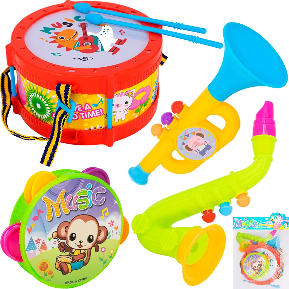 Комплектация: барабан, 2 палочки, бубен, труба, саксафон