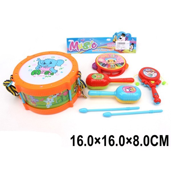 Комплектация: барабан - 1 шт, палочки - 2 шт, погремушки - 3 шт, бубен - 1 шт