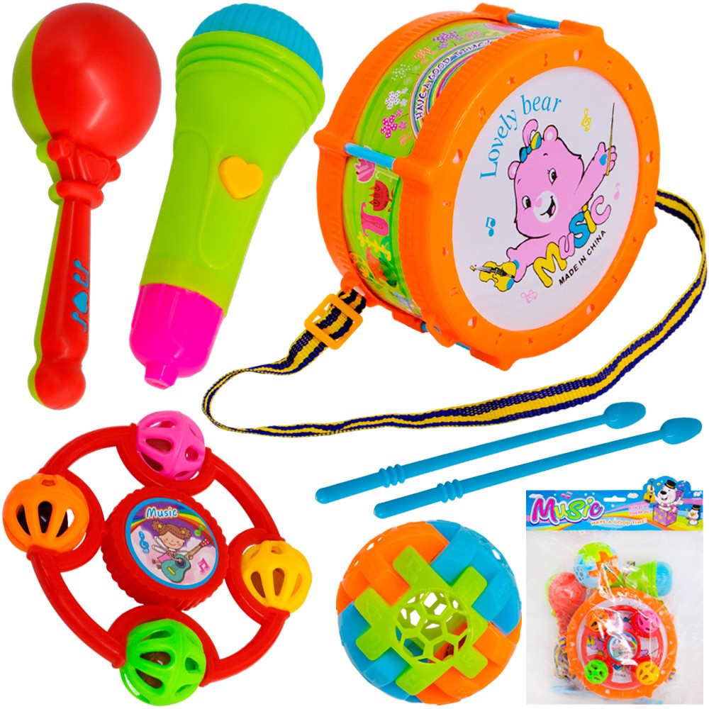 Комплектация: барабан - 1 шт, палочки - 2 шт, погремушки - 2 шт, микрофон - 1 шт, шар - 1 шт