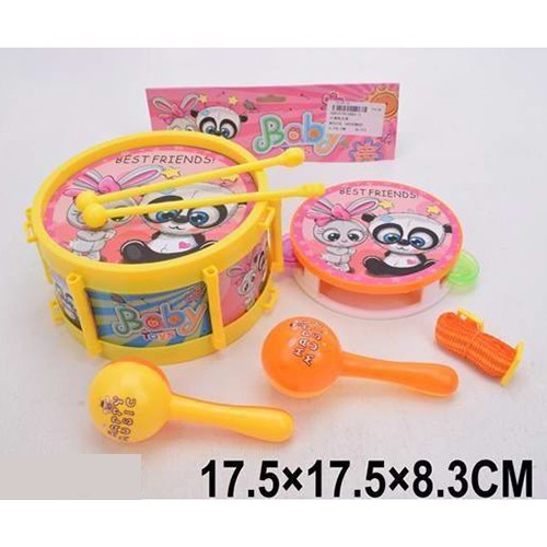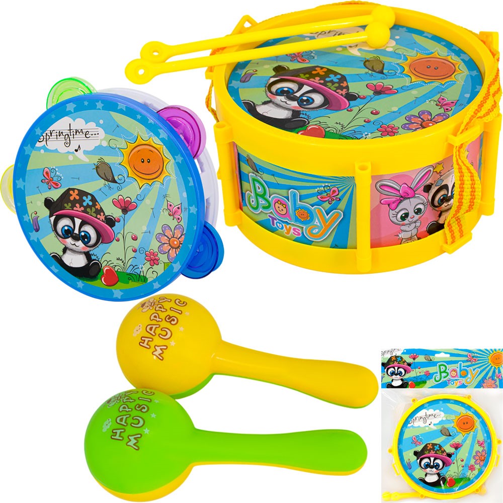 Комплектация: набор музыкальных инструментов (барабан, 2 палочки, 2 маракаса, бубен)