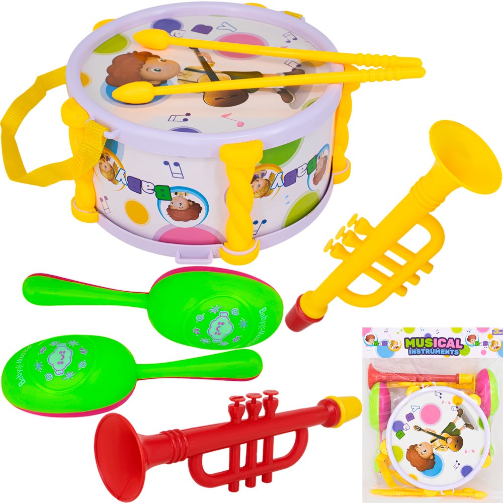Комплектация: барабан - 1 шт, палочки - 2 шт, погремушки - 2 шт, труба - 2 шт