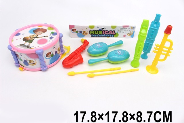 Комплектация: барабан - 1 шт, погремушки - 2 шт, труба - 4 шт, палочки - 2 шт