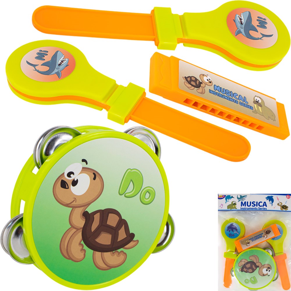 Набор игрушечных музыкальных инструментов станет отличным подарком для юных музыкантов.