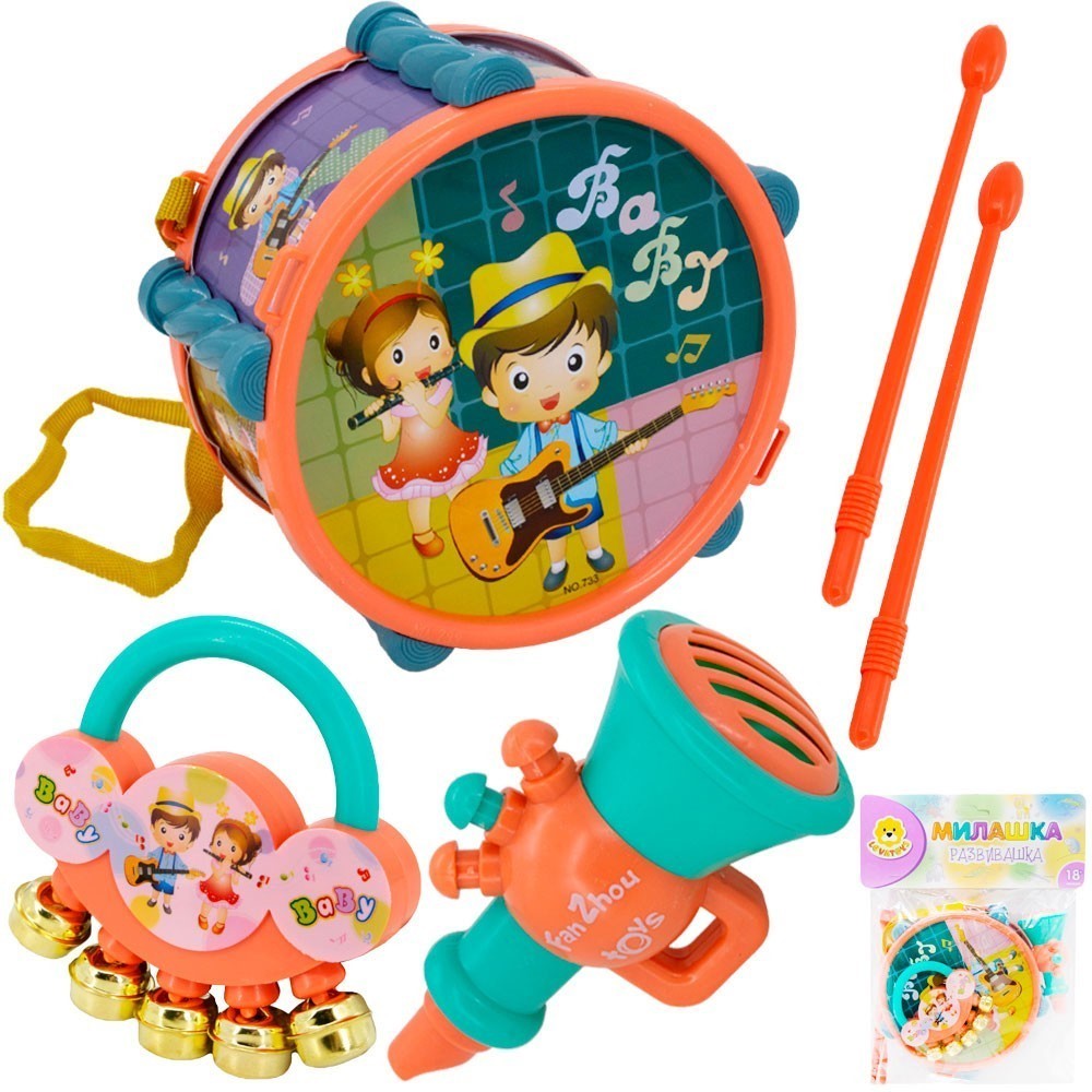 Комплектация: игрушечные музыкальные инструменты – 5 шт (барабан, дудка, барабанные палочки 2 шт, бубенцы)