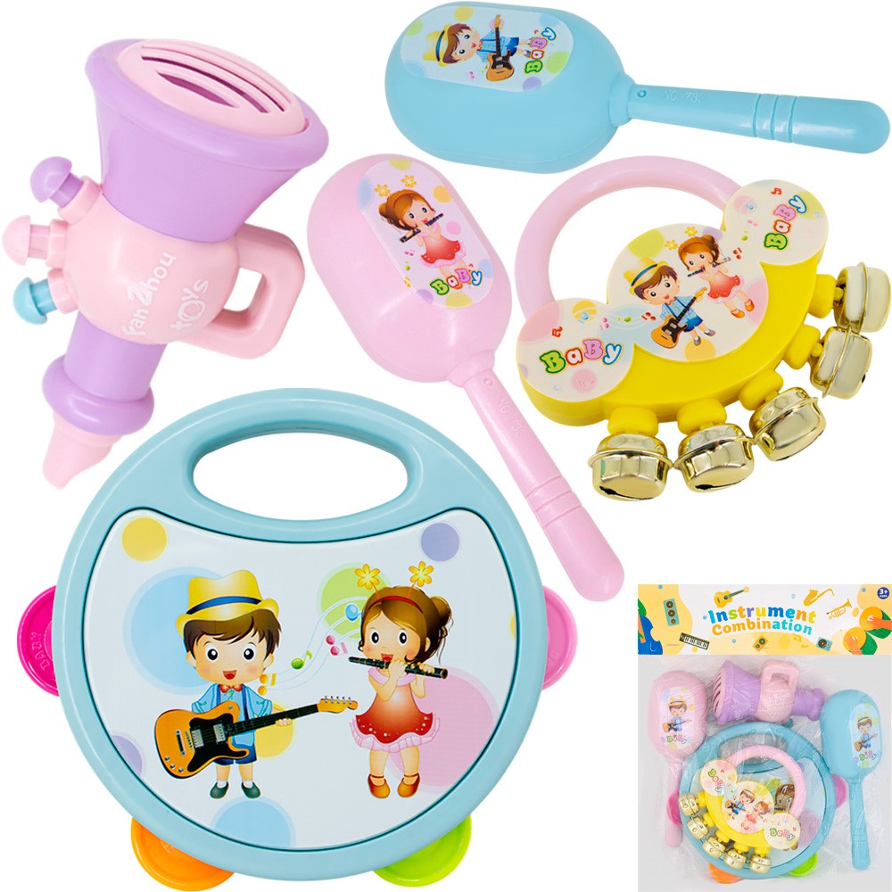 Комплектация: бубен - 2 шт, погремушки - 2 шт, труба - 1 шт
