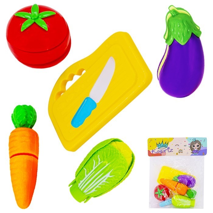 Реалистичные муляжи продуктов разделены на половинки, которые соединяются липучкой. В процессе игры развивается мелкая моторика пальчиков, фантазия и, самое главное, малыши приучаются быть хозяйственными.