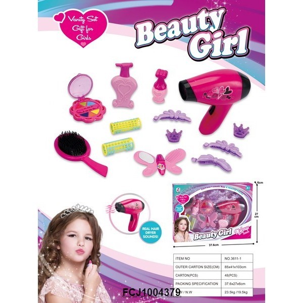 Комплектация: фен - 1 шт, расческа - 1 шт, бигуди - 2 шт, флакон - 2 шт, заколки - 5 шт, косметика - 1 шт, расческа-зеркало - 1 шт.