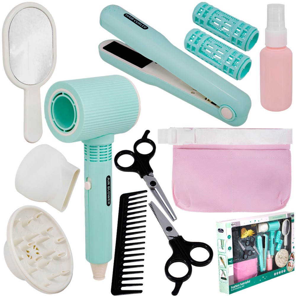 Комплектация: фен - 1 шт, расческа - 1 шт, зеркало - 1 шт, ножницы - 1 шт, филировочные ножницы - 1 шт, флакон - 1 шт, насадки на фен - 1 шт, сумка - 1 шт, плойка - 1 шт, бигуди - 2 шт, зажим для волос - 2 шт, карта - 1 шт