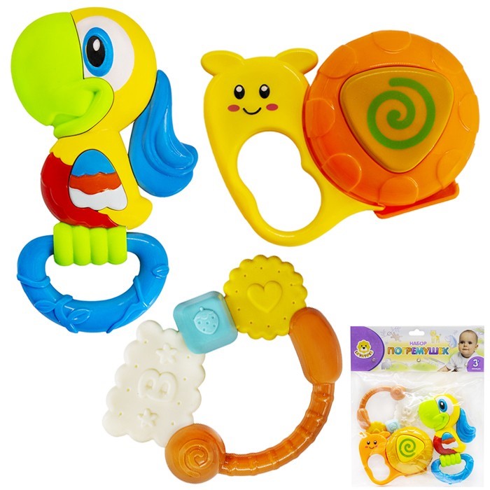 Комплектация: попугай (12,5 х 7 см) - 1 шт., улитка (8 х 10 см) - 1 шт., погремушка с цветными фигурками (8 х 9,5 см) - 1 шт.