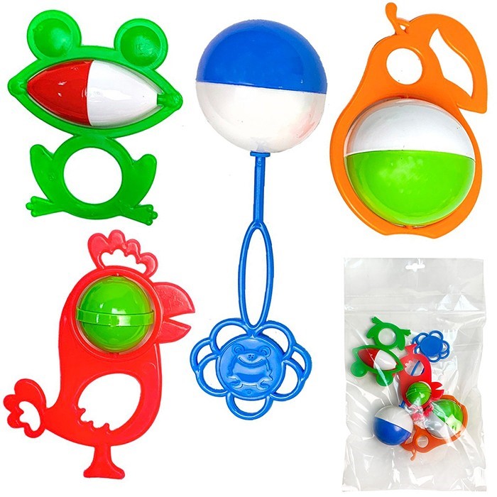 Комплектация: погремушка «Лягушонок», погремушка «Попугайчик», погремушка «Смешинка», погремушка «Груша»