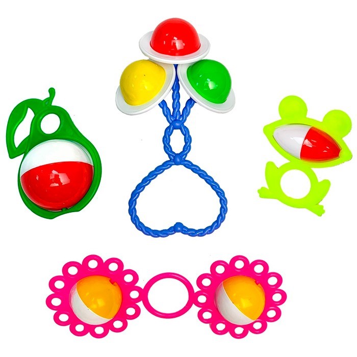 В комплекте: погремушка «Груша», погремушка «Букетик», погремушка «Лягушонок», погремушка «Снежинка»