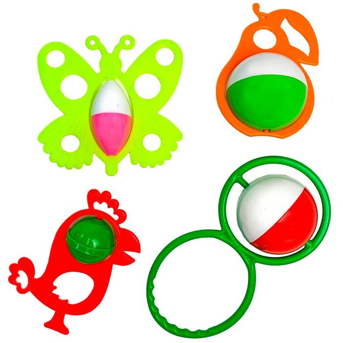 В комплекте: погремушка «Бабочка», погремушка «Груша», погремушка «Попугайчик», погремушка «Лялечка»