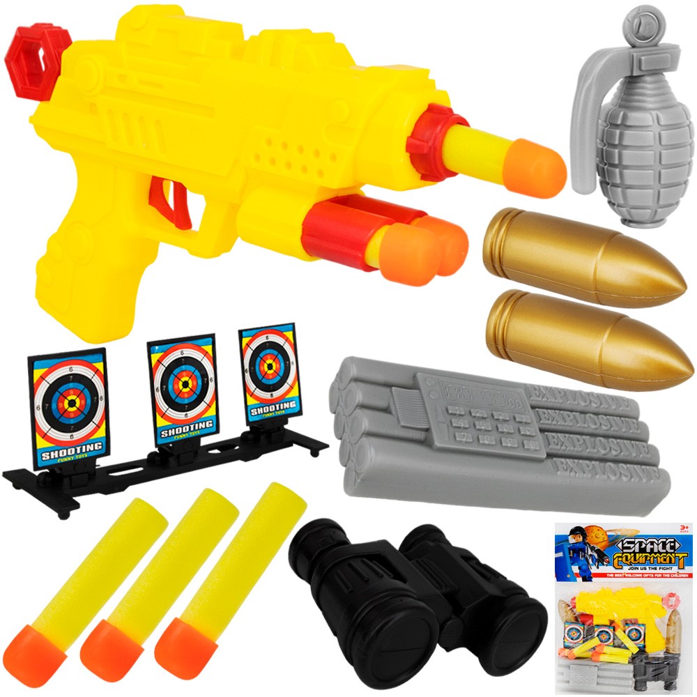 Комплектация: оружие - 1 шт, пули - 6 шт, мишень - 3 шт, граната - 1 шт, патроны - 2 шт, бомба - 1 шт.