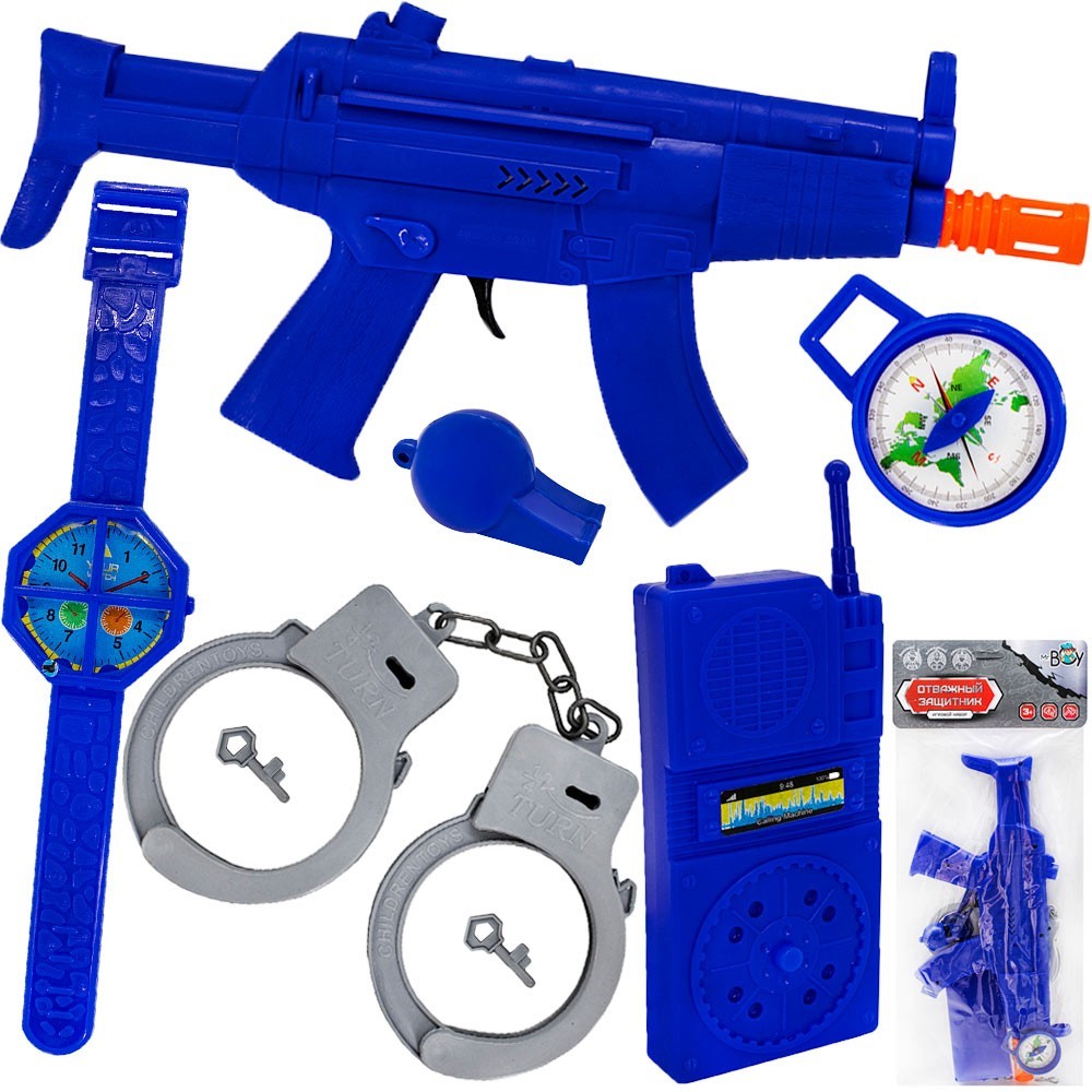 Комплектация: автомат – 1 шт., рация – 1 шт., наручники – 1 шт., ключи от наручников – 2 шт., компас – 1 шт., наручные часы – 1 шт., свисток – 1 шт.
