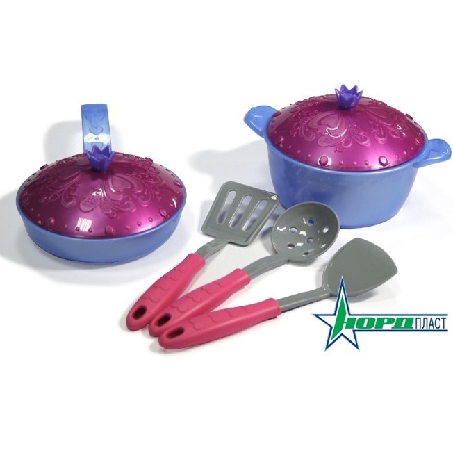 Комплектация: половник, 2 лопатки для сковороды, кастрюля и сковородка с крышками.