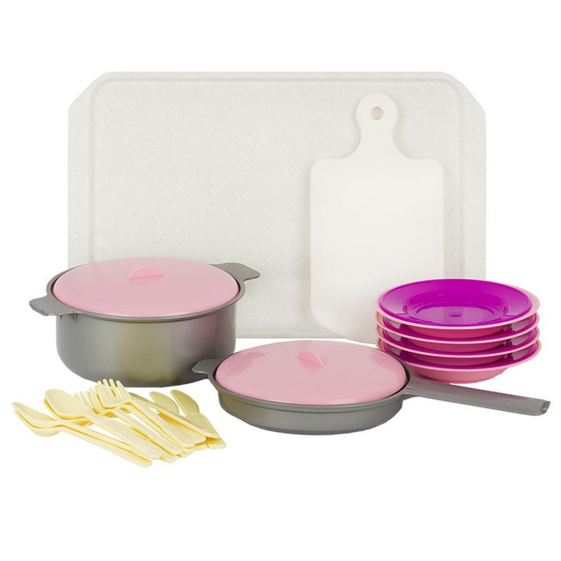 Комплектация: 26 предметов (4 большие тарелки, 4 маленькие тарелки, 4 ложки, 4 ножа, 4 вилки, доска разделочная, поднос, кастрюля, сковорода, 2 крышки)