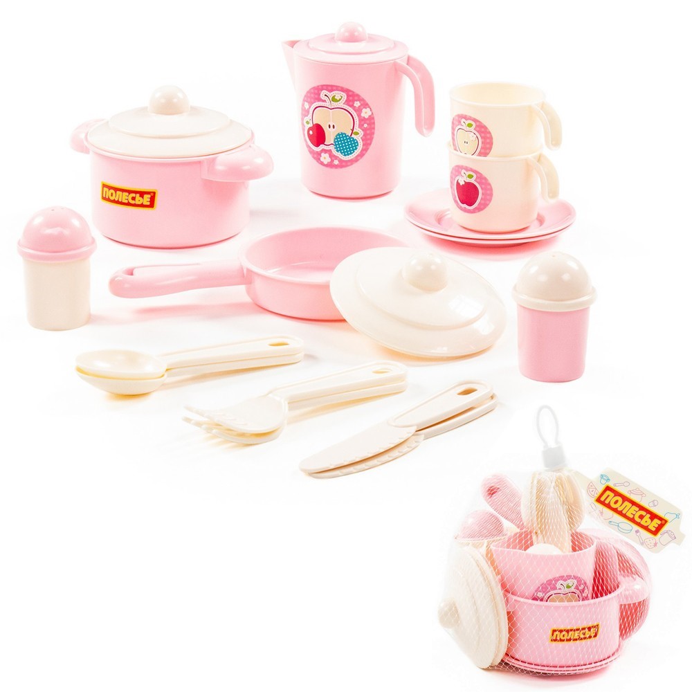 Комплектация: чашка – 2 шт., блюдце – 2 шт., нож – 2 шт., ложка – 23 шт., вилка – 2 шт., чайник с крышкой – 1 шт., солонка – 2 шт., кастрюля с крышкой – 1 шт., сковорода – 1 шт.