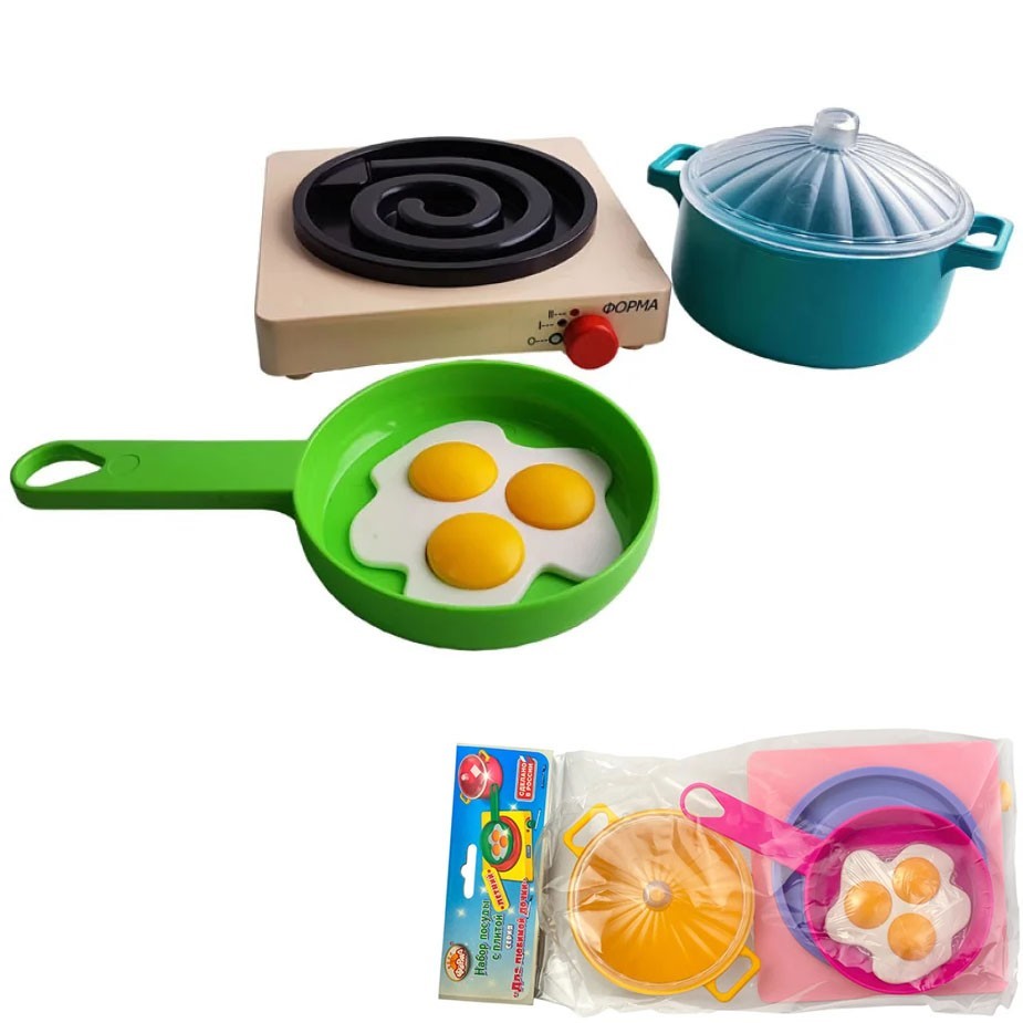 Комплектация: плита, сковорода, кастрюля с крышкой, яичница
