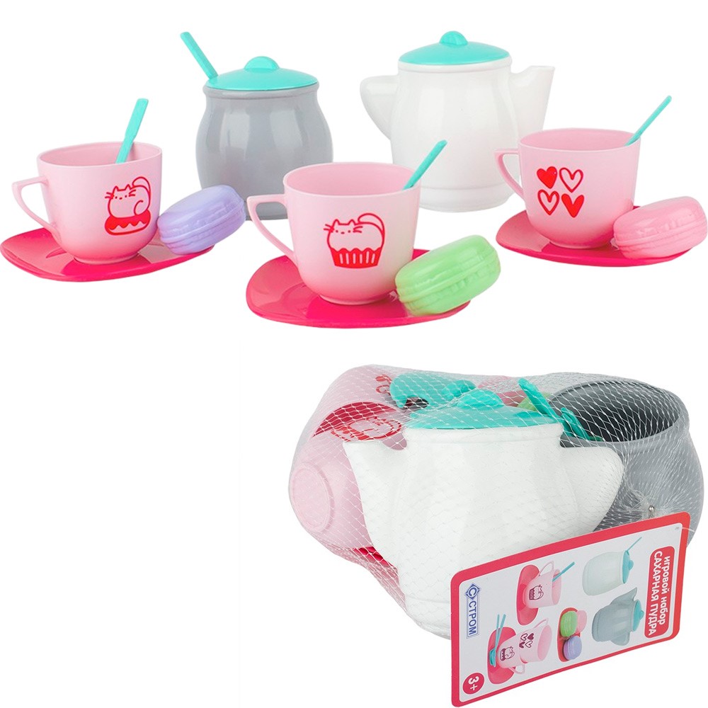 Комплектация: блюдце - 3 шт., чашка - 3 шт., крышка - 2 шт., макарун - 3 шт., чайник - 1 шт., сахарница - 1 шт., ложка - 4 шт.