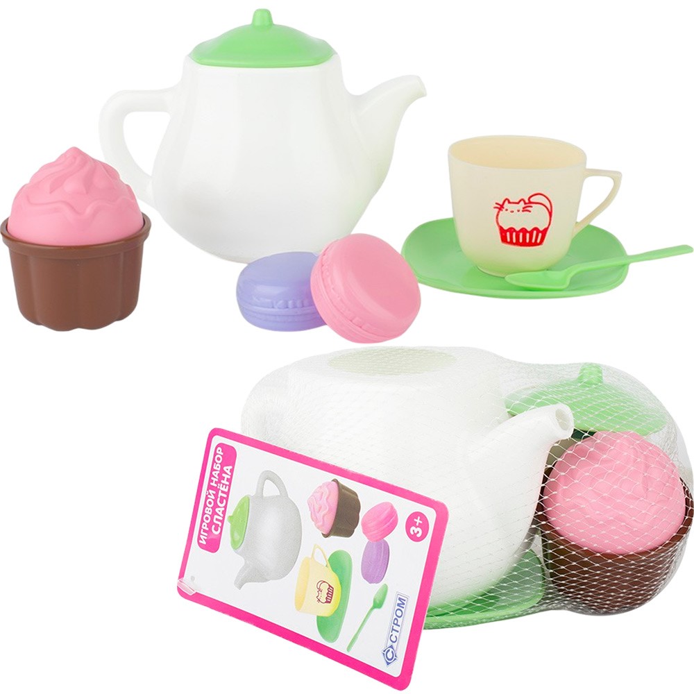 Комплектация: блюдце - 1 шт., чашка - 1 шт., ложка - 1 шт., макарун - 2 шт., чайник - 1 шт., капкейк - 2 шт.