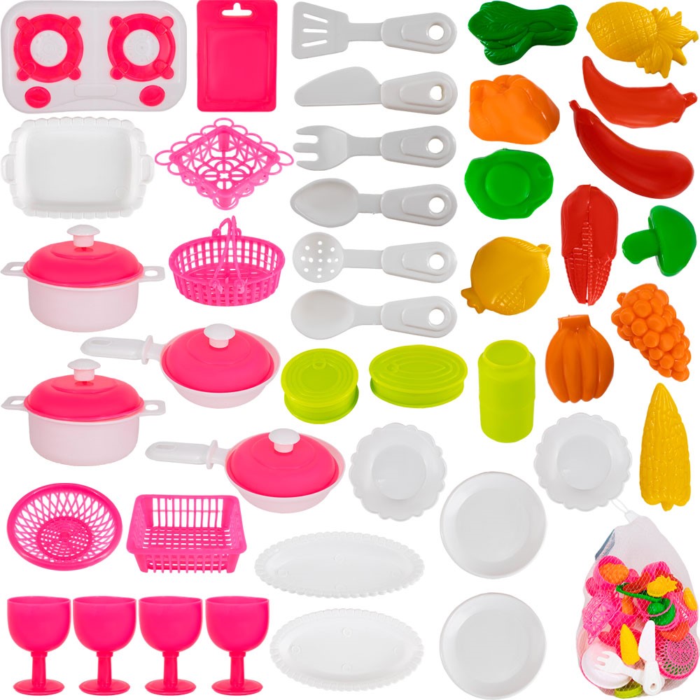 Комплектация: кастрюли с крышками, сковородки с крышками, плита, тарелки, столовые приборы, корзинки, разделочная доска, бокалы, пластиковая еда