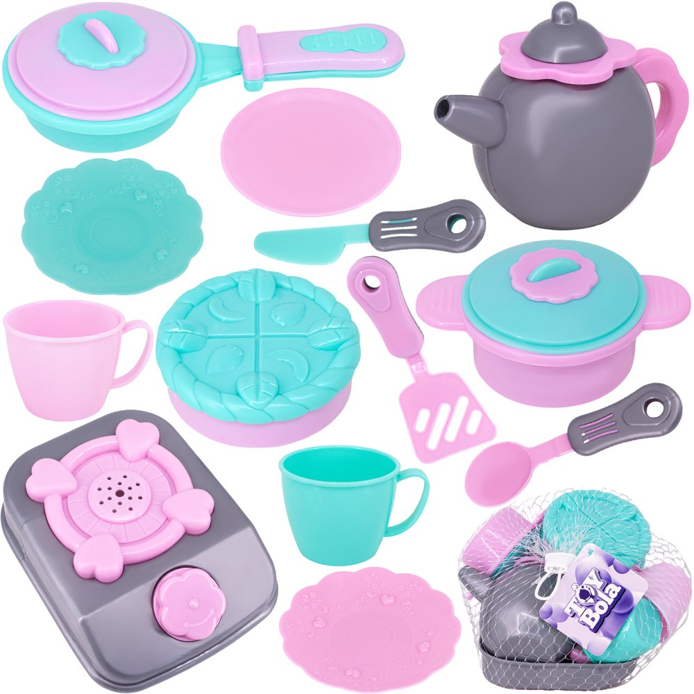 Комплектация: чашки - 2 шт, блюдце - 3 шт, ложки - 1 шт, чайник - 1 шт, плита - 1 шт, сахарница - 1 шт, лопатка - 1 шт, кастрюля с крышкой - 1 шт, сковорода с крышкой - 1 шт, десерт - 1 шт