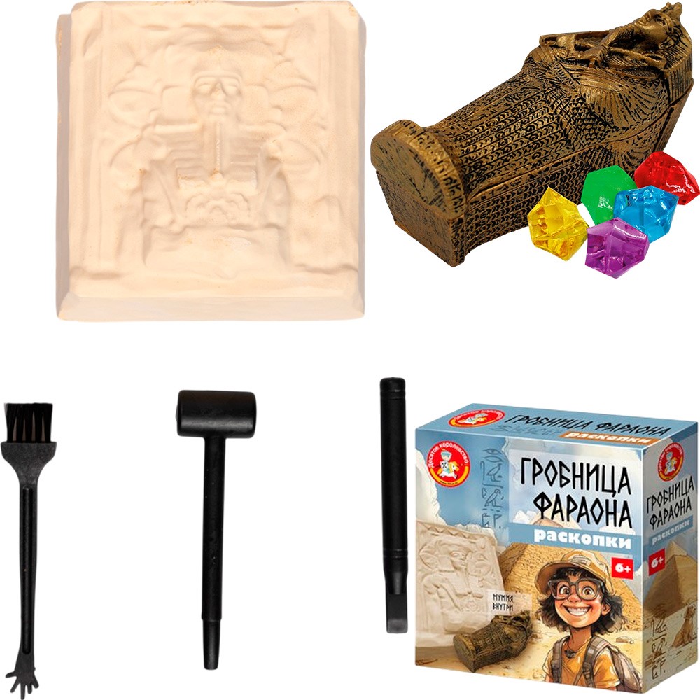С помощью инструментов, входящих в набор, ребенок сможет снять с бруска слой гипса, откопать фигурку, а остатки гипса удалить щеточкой или при помощи воды.